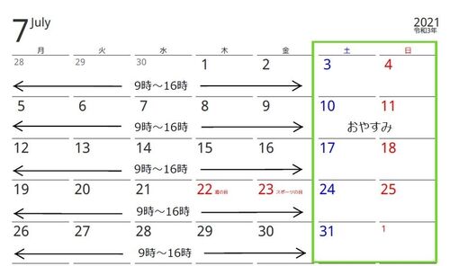2021年7月の予定です。営業日 平日(9時~16時頃)おやすみ 土曜日、日曜日(タップorクリックで拡大します。)読書空間 ひつじ日和